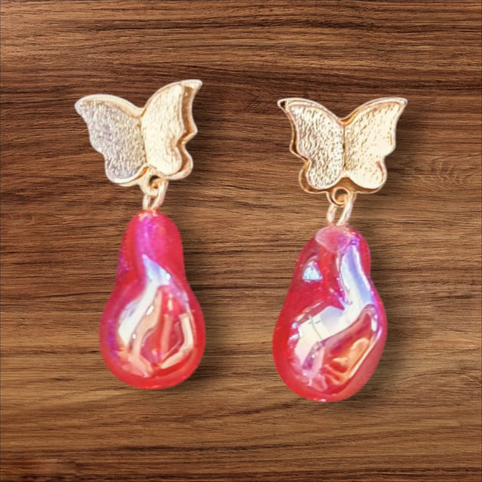 Add a playful pop of color and whimsical charm to your look with the Blush Bloom Butterfly Earrings by Ikshaya. Inspired by Korean fashion aesthetics, these statement earrings feature a textured golden butterfly stud paired with a luminous, iridescent pink resin drop that dances with light at every angle.