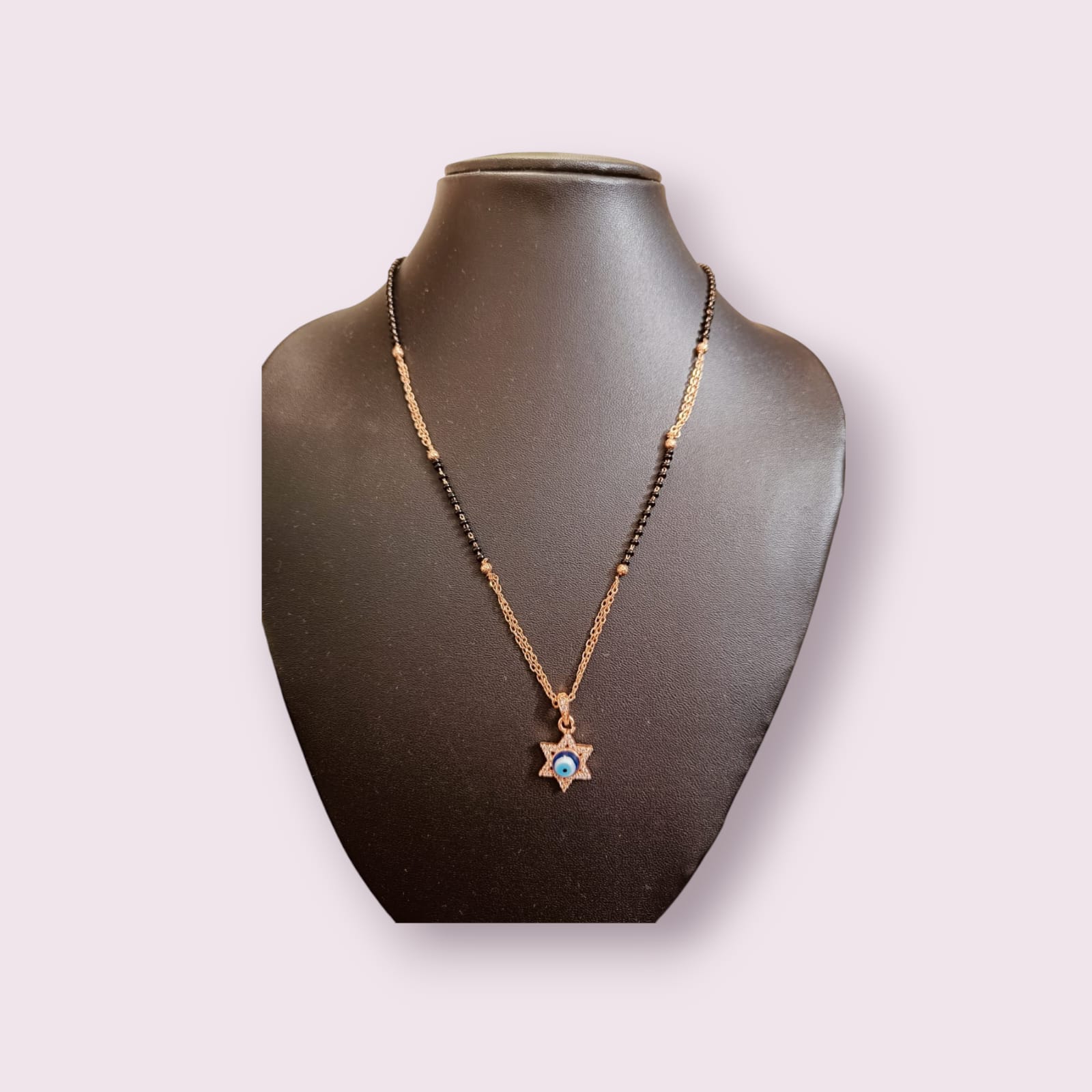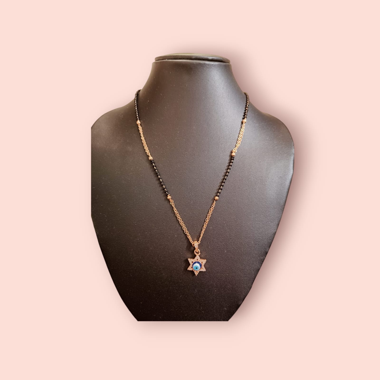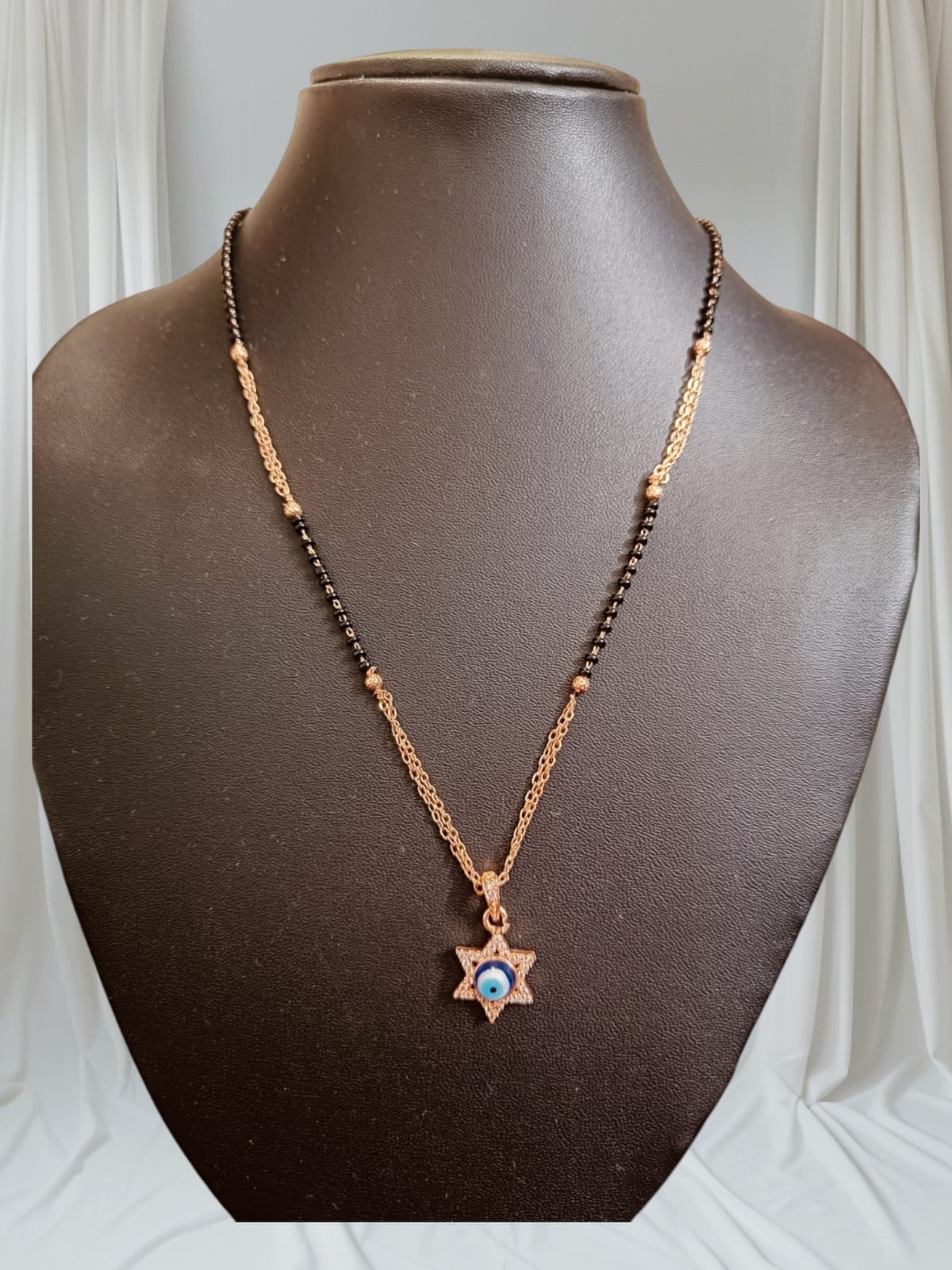 “Handcrafted Divine Protection AD Evil Eye Mangalsutra – a blend of spirituality and style with American diamond accents. Explore Ikshaya’s golden designs for weddings and daily wear.”