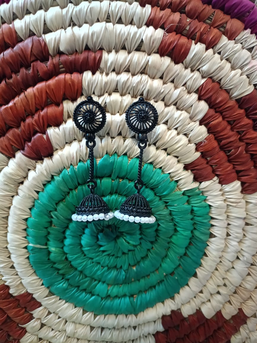 Make a striking style statement with the Ethnic Black Dome Jhumka with Bead Detailing by Ikshaya — a graceful fusion of bold design and traditional craftsmanship. Handcrafted with precision, this oxidized jhumka features a classic dome shape in matte black, beautifully accented with delicate beadwork that adds a subtle yet sophisticated flair.