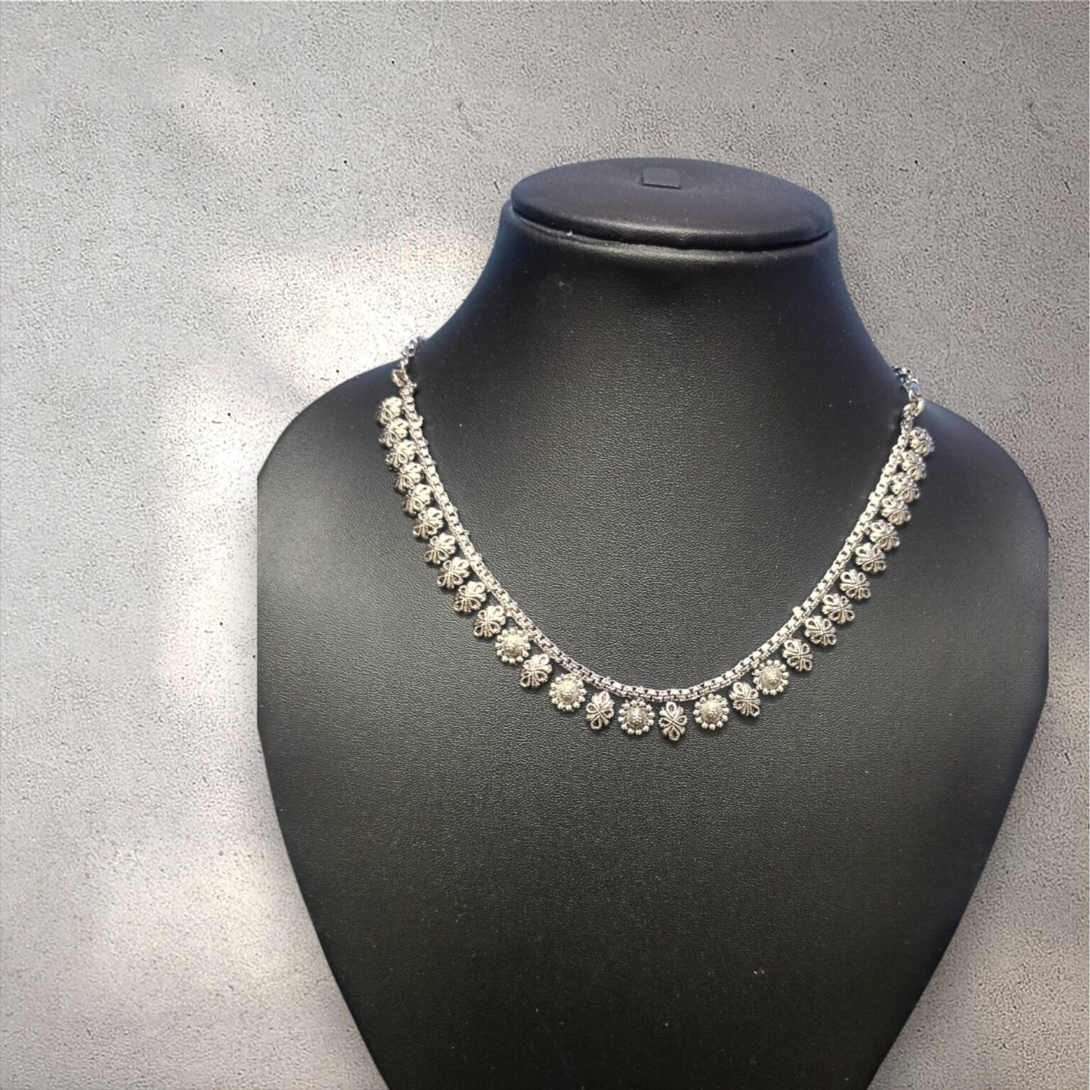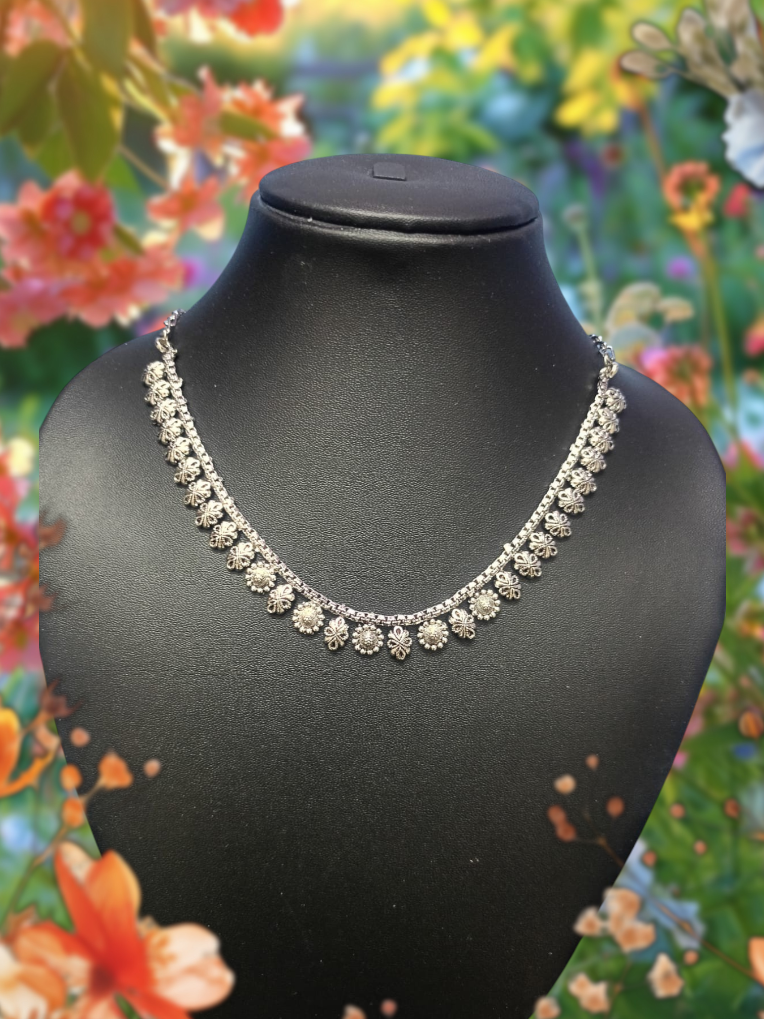 Step into timeless grace with the Heritage Noir Oxidized Statement Necklace by Ikshaya. This meticulously handcrafted piece celebrates India’s artisanal legacy through intricate floral . The antique finish adds a rustic charm, making it ideal for elevating both ethnic and contemporary outfits.