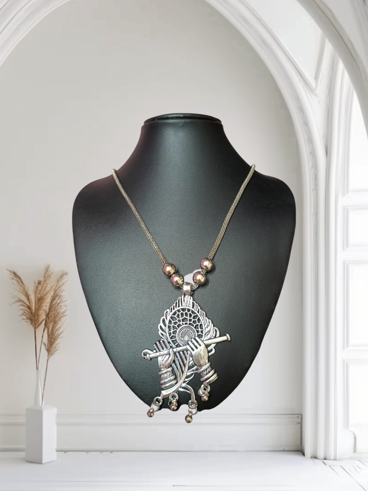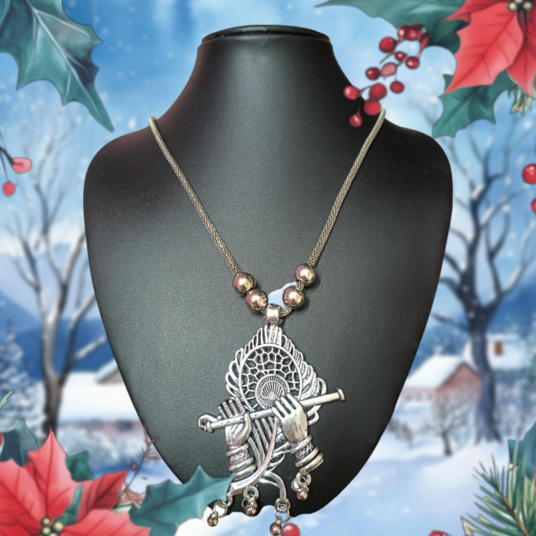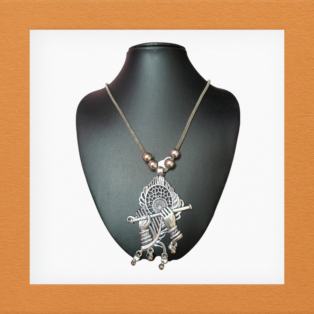 Intricately handcrafted by skilled artisans, this necklace features a detailed depiction of Krishna’s flute, adorned with artistic motifs and an antique oxidised finish. Perfect for those who seek jewelry with meaning, this pendant blends devotional charm with timeless ethnic style.