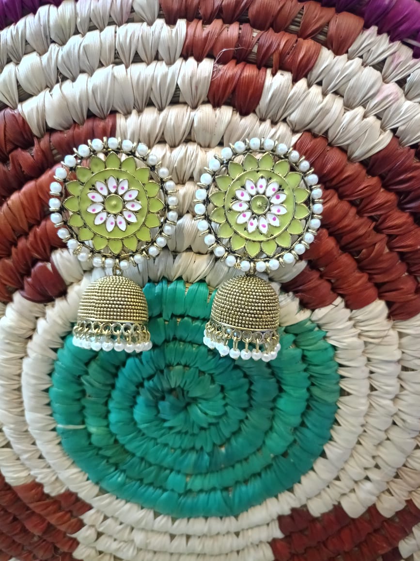 Each jhumki features a stunning oxidised finish paired with a radiant yellow base, adorned with a delicately hand-painted lotus motif at the center. The round stud is encircled by sparkling, teardrop-shaped stones and bordered with lustrous white beads for added elegance. The dome-shaped jhumki below is intricately detailed with floral designs and finished with a fringe of white beads, offering a perfect blend of color, craftsmanship, and cultural charm.