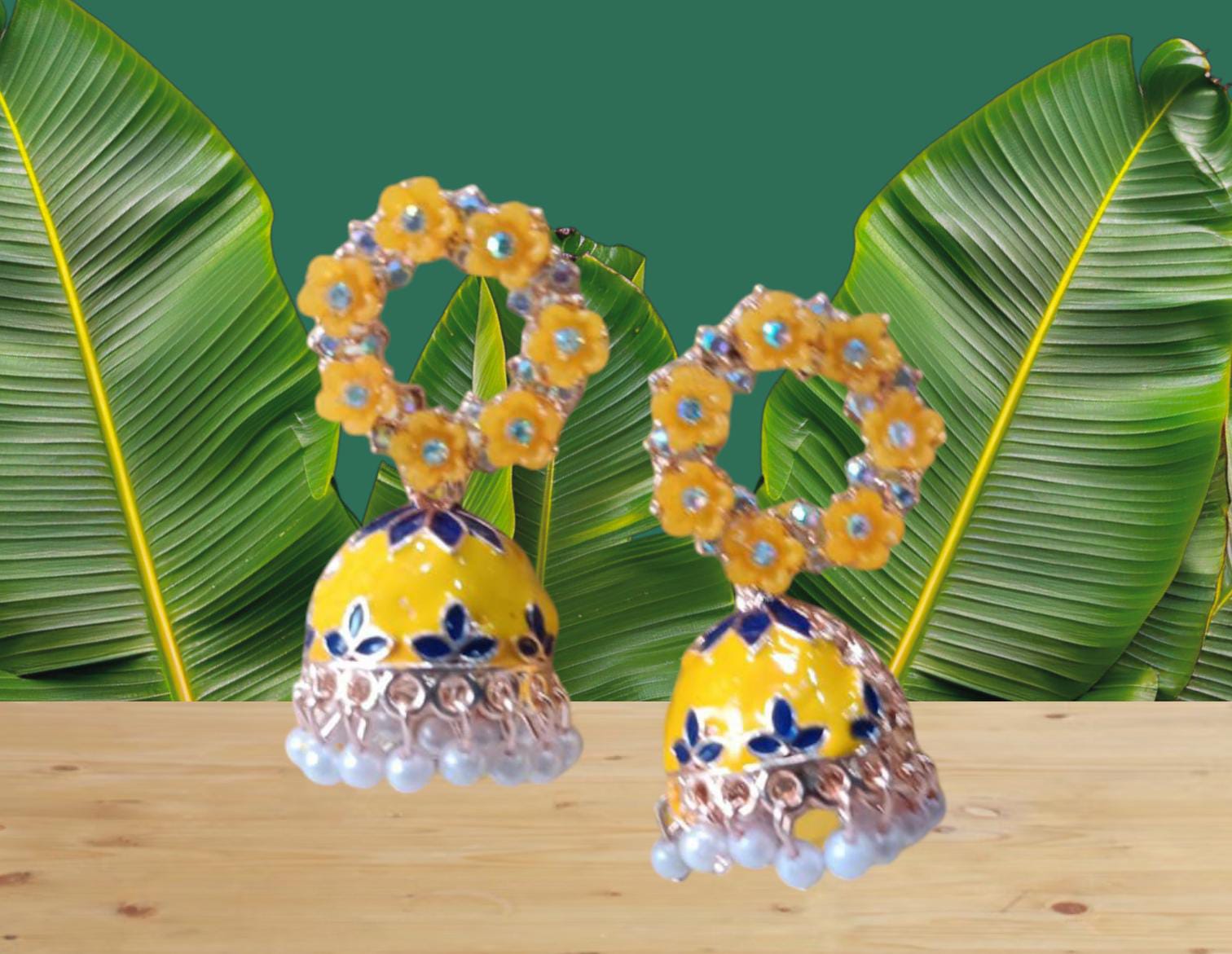 Discover the vibrant artistry of Ikshaya’s Meena Blossom Oxidised Minakari Jhumki. Handcrafted with intricate floral designs in yellow and turquoise, these statement earrings are perfect for festive and ethnic looks.