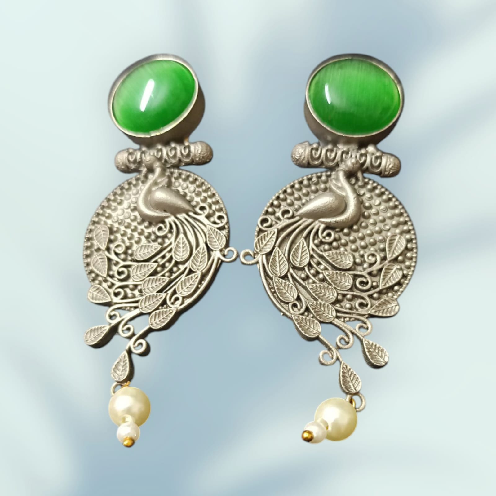 The antique gold-tone base is beautifully contrasted by the pastel green gemstone, offering a subtle yet striking accent—perfect for weddings, festive occasions, or elevated everyday wear. Lightweight and skin-friendly, these earrings are as comfortable as they are captivating.