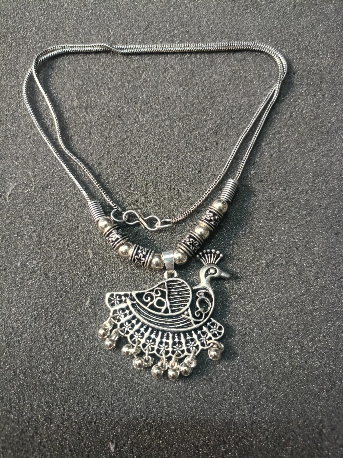 Adorn yourself with the majesty of tradition and art with the Peacock Grace Oxidized Silver Necklace by Ikshaya. Featuring a detailed peacock motif — the eternal symbol of grace, beauty, and pride — this handcrafted necklace brings a royal touch to your ethnic wardrobe.