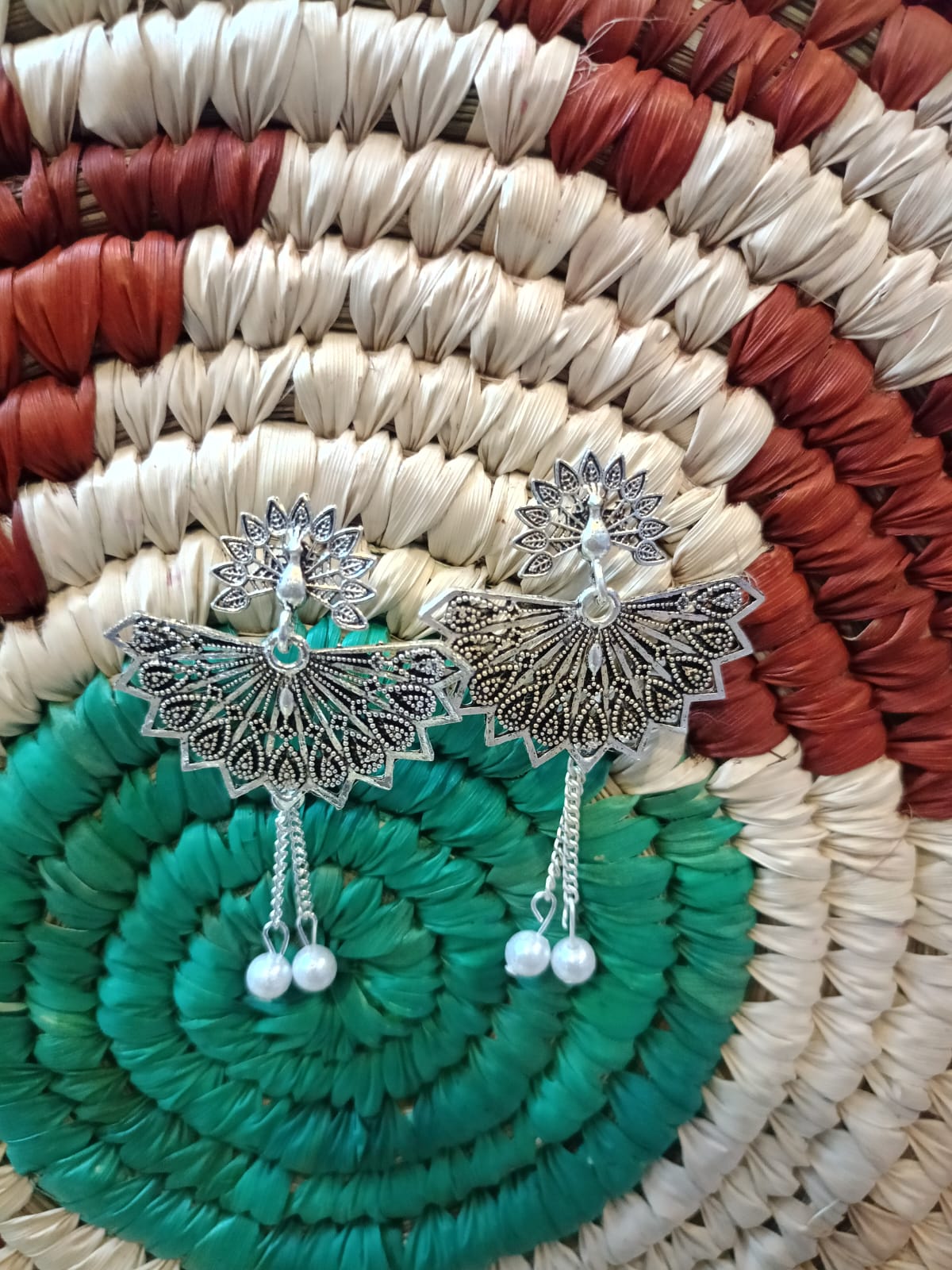 Add a touch of cultural heritage and timeless elegance to your jewelry box with the Pearl Dangle Peacock Oxidized Earrings by Ikshaya — where beauty meets tradition.