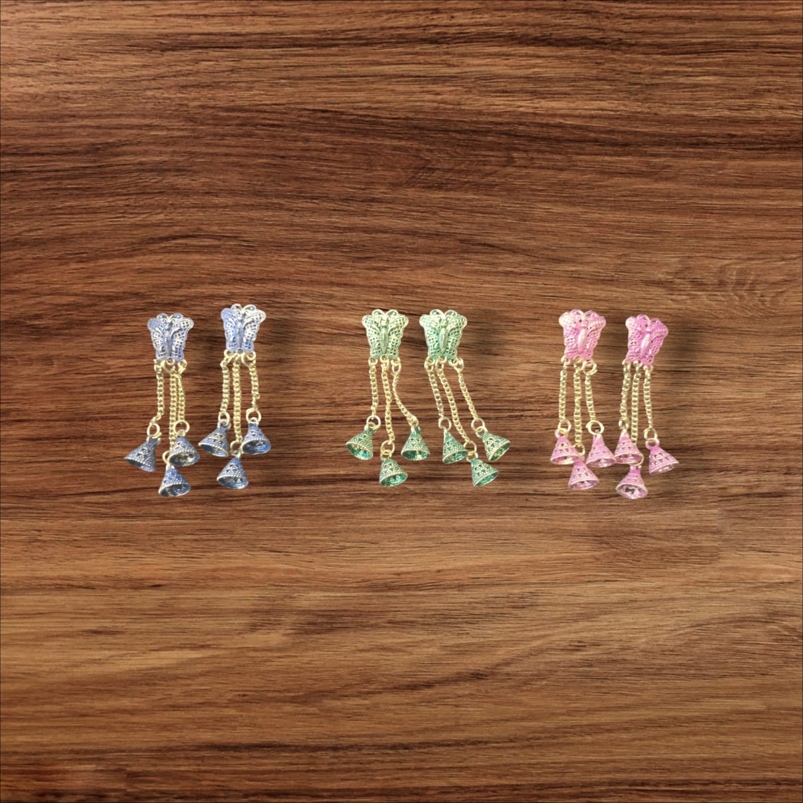 Delicately designed with dainty bell charms, these earrings bring together traditional charm and modern elegance. Available in stunning shades of Sky Blue, Mint Green, and Blush Pink, they create a light, rhythmic jingle with every movement — a perfect match for festive outfits, weddings, or everyday ethnic chic.