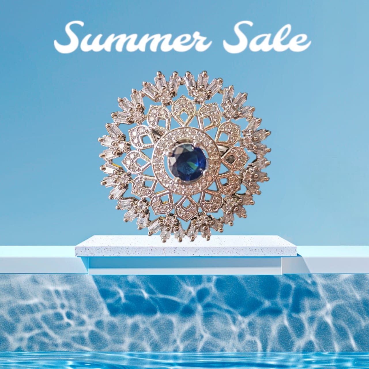 Add a regal sparkle to your look with Ikshaya’s Royal Radiance AD Finger Ring, a statement piece designed to turn heads. This intricately crafted adjustable ring features a dazzling round-cut blue stone at the center, encircled by a radiant burst of premium American Diamonds (AD) that mimic the brilliance of real diamonds.