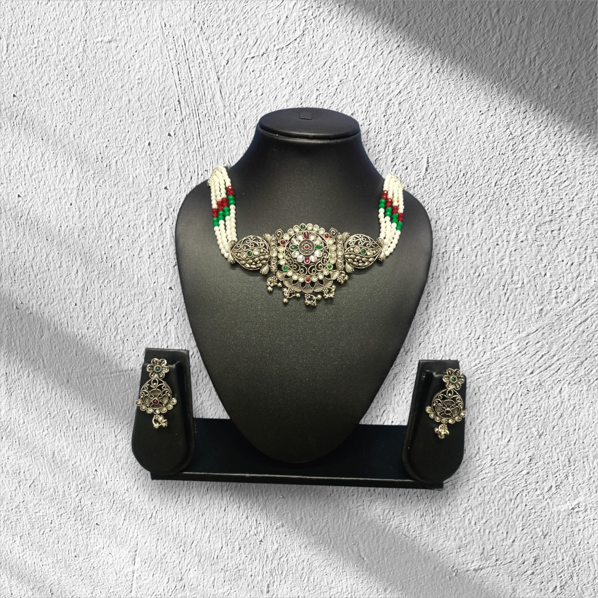 Crafted in antique silver finish, the necklace features intricate carvings and ethnic motifs, perfectly complemented by matching earrings that add grace and balance to your ensemble. Whether paired with a saree, kurta, or fusion wear, this set offers effortless charm and cultural flair.